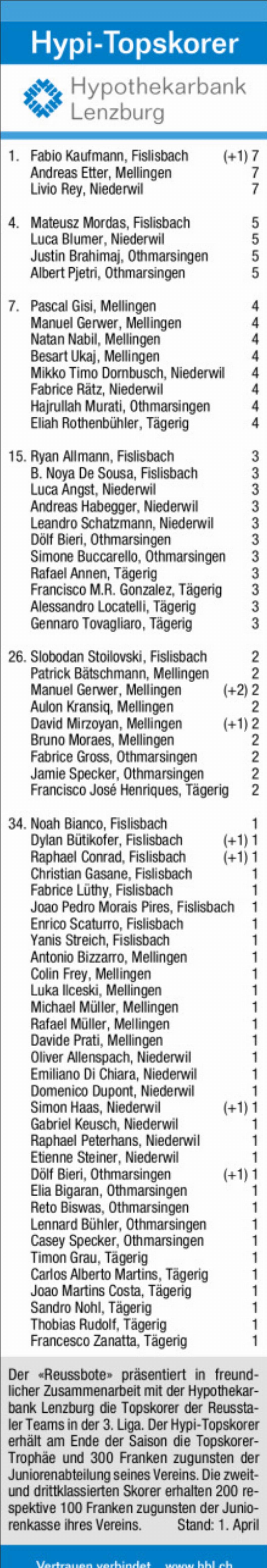 Der «Reussbote» präsentiert in freundlicher Zusammenarbeit mit der Hypothekarbank Lenzburg die Topskorer der Reusstaler Teams in der 3. Liga. Der Hypi-Topskorer erhält am Ende der Saison die Topskorer-Trophäe und 300 Franken zugunsten der Juniorenabteilung seines Vereins. Die zweitund drittklassierten Skorer erhalten 200 respektive 100 Franken zugunsten der Juniorenkasse ihres Vereins. Stand: 1. April