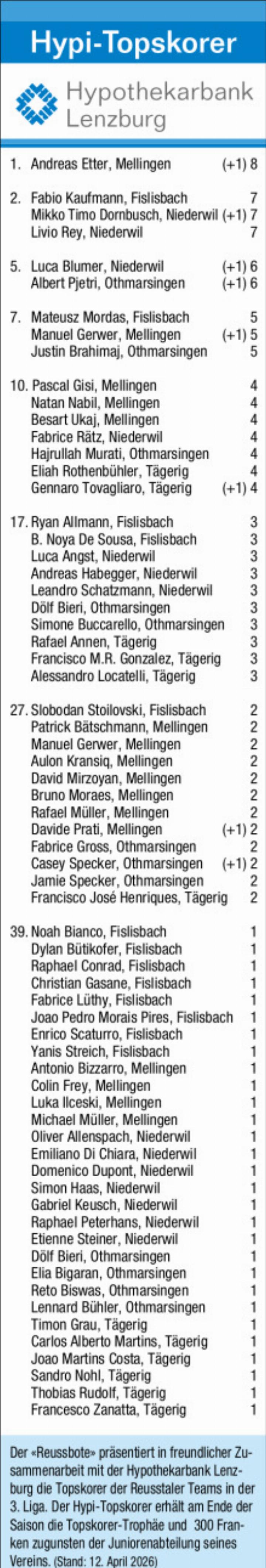 17.04.2026 SportDer «Reussbote» präsentiert in freundlicher Zusammenarbeit mit der Hypothekarbank Lenzburg die Topskorer der Reusstaler Teams in der 3. Liga. Der Hypi-Topskorer erhält am Ende der Saison die Topskorer-Trophäe und 300 Franken zugunsten der Juniorenabteilung seines Vereins. ...