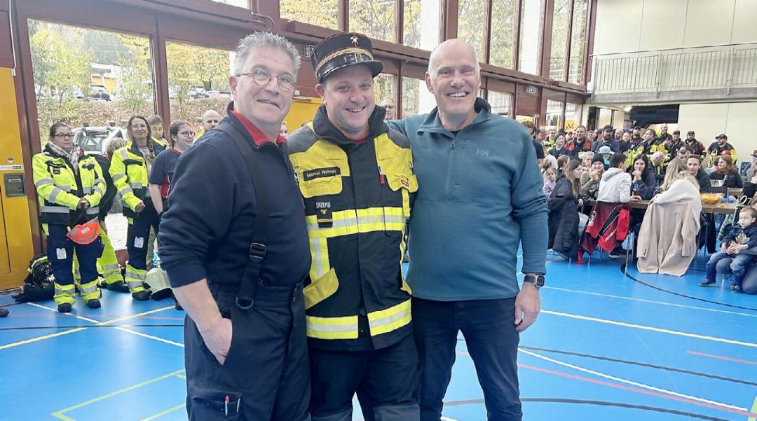 An seiner letzten Hauptübung beim Schulhaus Lohren in Fischbach-Göslikon wurde Roland Seiler (l.) am Samstagnachmittag nicht nur von seinen eigenen rund 50 Leuten der Feuerwehr Niederwil Fischbach-Göslikon verabschiedet. Den langjährigen Kommandanten – er war 32 Jahre lang im Dienst, 20 Jahre lang als Atemschutzchef und zuletzt sechs Jahre lang als Kommandant – ehrten auch Delegationen der umliegenden Feuerwehren, von der Regio Mellingen über Hägglingen, Wohlen, Zufikon bis Bremgarten. Der Niederwiler Ammann Norbert Ender (r.), Präsident der Feuerwehrkommission, dankte ihm und Seiler übergab sein Amt offiziell seinem Nachfolger Marcel Wehren (Mitte). (hhs)