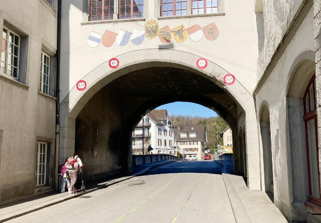 Laut eines aktuell aufliegenden Baugesuchs soll parallel auch das in Mitleidenschaft gezogene Brückentor saniert werden. Die Initiative ergriffen engagierte Privatleute. «Die Idee ist von den Eigentümern ausgegangen, dass man im Zuge der Sanierung der Hauptstrasse auch das Brückentor sanieren könnte», erklärt Marcus Hsu, Leiter Bau und Planung. Die Liegenschaft Grosse Kirchgasse 1 befindet sich in Privatbesitz. Man wolle die Gelegenheit nutzen, wenn der Verkehr für die Brückensanierung gesperrt sei, um ein Gerüst für die Sanierung aufzustellen, sagt Alex Gemperle, Eigentümer der Liegenschaft. «Der Torbogen ist relativ belastet durch den Verkehr und die Luftverschmutzung», erklärt er. Daher soll das Torinnere gestrichen werden und die Bogensteine ausgebessert werden. «Das alte Rathaus mit dem Bogentor steht unter Bundesschutz», so Gemperle. Daher erfolge die Sanierung unter Begleitung des Denkmalschutzes. Das Baugesuch beinhaltet jedoch nur die Bogensteine, die Decke sowie die rechte Wand – von der Altstadt aus gesehen. Die linke Wand gehört zur Liegenschaft Bruggerstrasse 2, deren Eigentümer laut Grundbuch in England leben. Ob diese auch gestrichen wird, ist also noch offen: «Wir haben die Eigentümer kontaktiert, aber noch keine Rückmeldung erhalten», so Marcus Hsu.