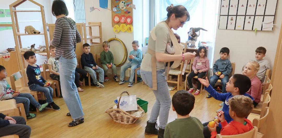 Zuerst gehts in den Kindergarten Neugrüen 1. Brav sitzen die Buben und Mädchen auf ihren Stühlchen und blicken neugierig zu den fremden Besuchern. «Ich bringe euch etwas Gesundes, etwas Süsses und etwas zum Knabbern», sagt Mirjam Portmann zu ihnen. Sprich: viele frische Äpfel liegen im Korb, wenige Packungen mit Kinder-Schokolade und mehr mit Guetzli. «Mmmm» macht Nael, als er genussvoll an einem Guetzli kaut. «Das ist gut», findet er. Und sein Nachbar David buchstabiert dem Journalisten vorsichtshalber gleich seinen Namen – «D.A.V.I.D» – falls er auch befragt werden sollte. «Jeder darf jetzt einen Apfel nehmen», sagt Kindergärtnerin Yvonne Suter. Sie und Verena Sommer, welche fremdsprachigen Kindern in der Klasse Deutsch als Fremdsprache auf spielerische Art beibringt, betreuen die Kleinen. Alles geht ganz gesittet vonstatten und die Kinder geniessen den spendierten Znüni. «Daaanke vielmals», tönt es laut und fröhlich am Schluss durch das Lokal.