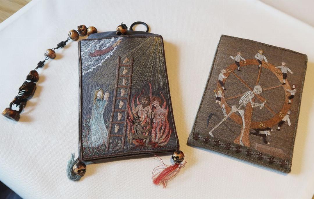 Die Breverl von Regula Schneider erzählen vom Glauben, der Pilgerei, von historischen Figuren, der Liebe und der Auseinandersetzung mit dem Tod. Dazu hat sie auch ein Buch herausgegeben, das man an der Vernissage anschauen und kaufen kann. (es ist das Zweite. Eines ihrer Breverl trägt beispielsweise den Titel «Maria Licht». Sie hat sich dafür an einer Votivtafel in der Kirche von Trunin Graubünden inspiriert. Diese Votivtafel, entdeckte sie erstaunt, wurde von Alois Carigiet gemalt und unterschrieben. Ein anderes Breverl zeigt das Kloster Gnadenthal und eine über ihm schwebende Mutter Gottes. Dem Tod in Form von Skeletten oder Totenköpfen sind weitere Breverl gewidmet – der Tod war im Mittelalter ein sehr häufiges Motiv.