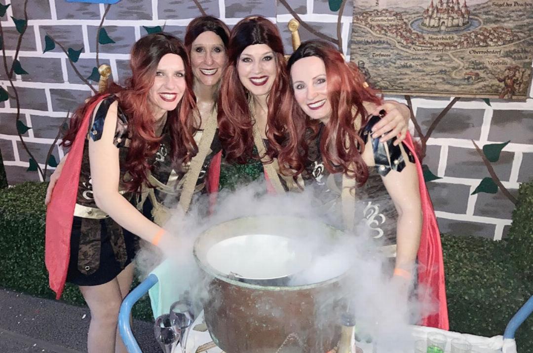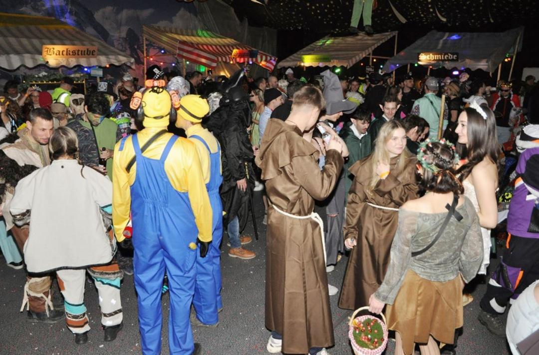 Die Bars trugen dem Motto getreue Namen wie «Kräuterkammer», «Spinnerei», «Backstube». Die VIP-Bar im Untergeschoss hiess «Sherwood Forest» – man betrat die gemütliche Holztaverne durch ein künstliches Wäldchen. Auf die Beine gestellt haben das alles Mitglieder der Guggenmusiken Bänkli-Clique und Sumpfberghüüler aus Oberrohrdorf, welche den Anlass wiederum organisierten. «Wir sind zwei Vereine mit je circa 40 Mitgliedern, es gab also viele helfende Hände», sagte die Präsidentin der Sumpfberghüüler, Manuela Knopf, am Anlass. «Das Aufstellen und Dekorieren mit rund 50 Personen dauerte eineinhalb Tage.» Das Resultat konnte sich sehen lassen. Doch was nützt die schönste Deko ohne die sie lebendig machenden Fasnächtler? Diese trudelten am Samstag ab 19 Uhr immer zahlreicher ein. So viele schön gewandete Königinnen, stolze Könige und Prinzen, lustige Hofnarren, die «Ammen des Königs», Hobbits, Nonnen, Mönche und sogar Rapunzel an einem Ort versammelt zu sehen, ergab ein schönes Bild. Die Kostüme und Masken waren teilweise sehr aufwendig und viele bewarben sich damit für die Maskenprämierung. Für tolle Stimmung sorgten auf der Bühne zum Einstieg die Guggenmusik Opus 5614 aus Sarmenstorf, gefolgt von Arbor Felix Hüüler, um 22 und um 23 Uhr fetzten die zwei einheimischen Guggen. Den krönenden Schluss markierten die Stiefeliryter aus Muri. Im Zelt-Restaurant draussen sorgten weitere Guggen wie die Sprützehüsli Clique aus Tägerig für heissen Fasnachtssound. Das zumeist jüngere Publikum ging begeistert mit. Über 1000 Fasnächtlerinnen und Fasnächtler feierten am Hinterbächli-Ball ausgelassen die närrische Jahreszeit. Es hatte viele Stammgäste dabei. «Wir kommen seit fünf Jahren hierher», sagt Francesco Esposito aus Bellikon, der mit seiner Freundin als Bär und Giraffe gekommen war. «Wir zelebrieren die Fasnacht immer», sagte auch Mireille Meier aus Künten. Sie braute mit Tochter, Schwägerin und Kollegin den Zaubertrank von Asterix und Obelix im Königreich Rohrdorferberg. Manchmal ist die Fasnacht auch nützlich und romantisch: «Vor 20 Jahren habe ich meinen Mann am Ball kennengelernt», verriet Meier. Und gab eine Runde süssen Zaubertrank für den Reporter aus.