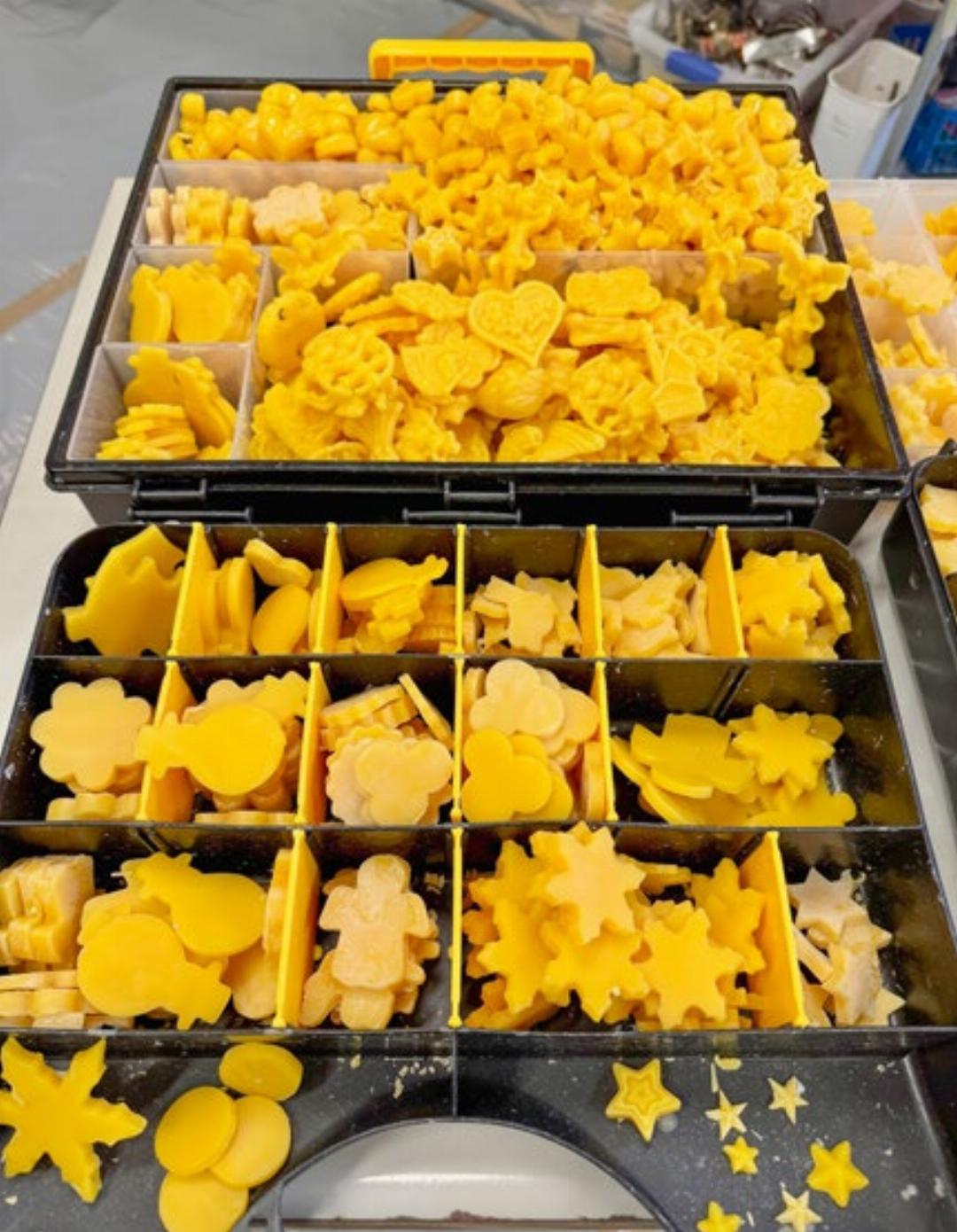 Und dann war es endlich soweit. Am Samstagmorgen um 11 Uhr wurden die Türen für die Bevölkerung von Mellingen und Umgebung geöffnet. Kinder mit ihren Eltern, aber auch ältere Menschen oder Jugendliche nahmen sich an diesem kalten und nieseligen Samstag Zeit, eine Kerze aus Bienenwachs zu ziehen. Viele helfende Hände waren im Einsatz, um aus den fertig gezogenen Kerzen kleine Kunstwerke zu schaffen. Einfache Kerzen mit kleinen Figuren, welche wie Kekse aus Wachsplatten ausgestochen wurden, fanden ebenso ihren Platz an den Kerzen wie filigrane Figuren. Andere Kerzen wurden mit Rillen verziert und wieder andere mit dem Wallholz viereckig gewallt, um dann kunstvoll verdreht zu werden. Mutige konnten unter Anleitung der Helfer die Kerze selber drehen und so wirklich eine «hand-made»-Kerze herstellen. Es war schön mitzuerleben, wie viele Menschen sich am Samstag und am Sonntag Zeit genommen hatten, diese schöne Tradition zu leben. Viele Gesichter sah man am Sonntag erneut, entweder weil eine begonnene Kerze noch fertiggestellt werden musste oder einfach, weil man die Ruhe beim Kerzenziehen in unserer hektischen Zeit geniessen wollte – Ruhe, obwohl der Raum zeitweise ziemlich voll war und eine fleissige Stimmung in der Luft lag. Insgesamt wurden an diesem Kerzenziehen-Wochenende 140 kg Wachs in wunderschöne Kunstwerke verwandelt, 210 Hotdogs gegessen und etwa 20 verschiedene, leckere Kuchen verkauft.