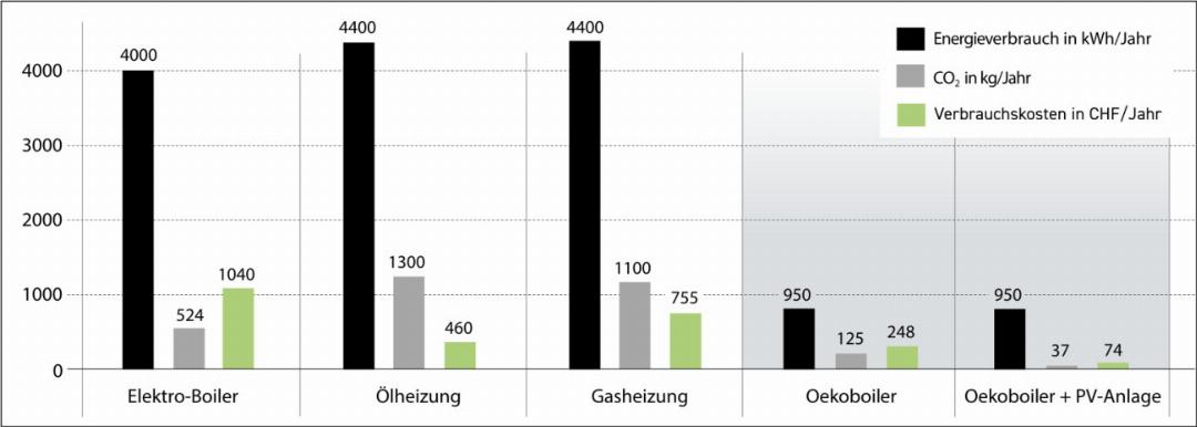 Diese Massnahme hat ein grosses Einsparpotenzial an CO2. Die Einsparung macht sich auf der Rechnung des Öl-Lieferanten bemerkbar: ca. 400 bis 500 Liter weniger Ölverbrauch pro Jahr werden bei einem 4-Personen Haushalt benötigt. Unter dem Strich resultieren geringere Kosten. Wird der Oekoboiler ausschliesslich mit dem Schweizer Strommix betrieben, so wird gegenüber Öl 10-mal oder Gas 9-mal weniger CO2 verursacht. Sobald Ökostrom oder die eigene PV-Anlage dazu kommen reduziert sich der CO2-Fussabdruck nochmals.