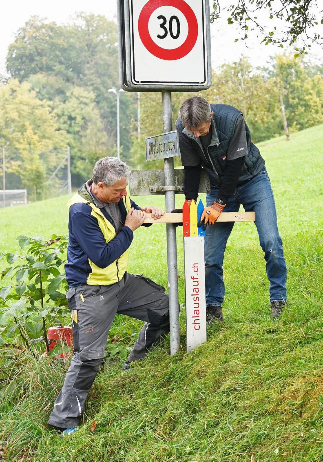 Der Chlauslauf in Niederrohrdorf hat eine lange Tradition: Etwa 30 Jahre lang richtete ihn der lokale Veloclub aus, dann übernahm ein kleines OK, das aus dem Tennisund Squashclub hervorgegangen war. Seit einigen Jahren nutzen René Düsel und Beat Steiner von diesem OK die Herbstschulferien dazu, den 8,3 Kilometer langen Kurs auszuschildern. Damit bieten sie den Läuferinnen und Läufern die weitherum einmalige Gelegenheit, zwei Monate vor dem Lauf, der dieses Jahr genau auf den 6. Dezember fällt, auf der «echten» Strecke zu trainieren.
