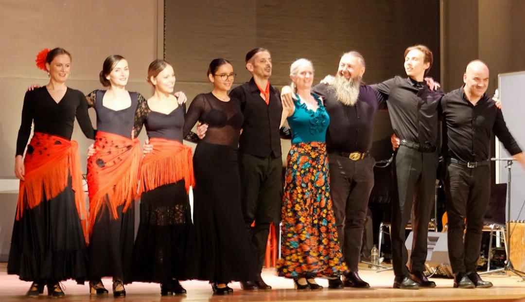 Fast fühlte man sich in der Aula Hüslerberg inmitten einer mediterranen, lebensfrohen Fiesta mit ausgelassenen, fröhlich feiernden Menschen. Mit sehr feingliedrigen, grazilen Bewegungen begann der erste Tanz, abgestimmt mit entsprechender Beleuchtung und Farbtupfern durch die Accessoires, entwickelte sich das Ganze zu einem expressiven Tanz. Mit selten gehörter Feinheit in der musikalischen Sprache des Flamencos begleiteten die beiden Gitarristen in virtuoser Innigkeit. Margret Spaar verstand es, sich mit ihrem berührenden Vibrato in die Herzen der Zuhörer zu singen. Ein gekonnter Einsatz des Cajón einerseits als Unterstützung der tänzerischen Expressivität, aber auch als Soloeinlage in überzeugender Virtuosität entlockte dem Publikum Applauseinlagen. Es war eine Flamenco-Show der Extraklasse! Diego Gónzalez López verstand es als Choreograf eine vielschichtige, abwechslungsreiche Show mit grosser Liebe zum Detail zu gestalten. Die perfekten Lichteinstellungen von Megatron rundeten das ganze ab. Gónzalez López ist Leiter von «Vientos del Sur – Südwind», er agierte auch als grossartiger Solotänzer und führte zwischen den Stücken mit Texten von Garcia Lorca und kurzen, informativen Erzählungen zu den verschiedenen Stilen des Flamencos durch das Programm. Christina Spaar, ebenfalls als Solotänzerin, rundete das Ganze mit ihrer grazilen Leichtigkeit perfekt ab. Es war ein grossartiges tänzerisches Highlight und eine Augenweide dazu. Tänzer und Tänzerinnen, die in ihrer tänzerischen Lebensfreude förmlich explodierten. Und dies alles in einer farbenfrohen, tänzerisch rhythmischen Perfektion. Mit Standing Ovations überzeugte das Publikum die Tanztruppe für Zugaben, die nichts unerfüllt liessen.