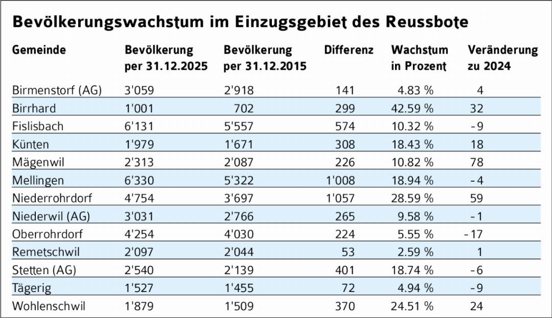 Betrachtet man nur die absoluten Einwohnerzahlen des vergangenen Jahres, fallen die Zu- und Abnahmen der Gemeinden im «Reussbote»-Einzugsgebiet nicht sehr ins Gewicht. Sie liegen maximal im zweistelligen Bereich (siehe Tabelle). Mit einem Plus von 78 Personen war der Bevölkerungszuwachs in Mägenwil 2025 am höchsten, gefolgt von Niederrohrdorf (+59) sowie Birrhard (+32) und Wohlenschwil (+24). Einige Gemeinden verzeichneten im letzten Jahr aber auch minimale Bevölkerungsrückgänge. Das grösste Minus wies mit 17 Personen Oberrohrdorf auf. Tägerig, Fislisbach, Stetten, Mellingen und Niederwil verzeichneten einen einstelligen Rückgang.