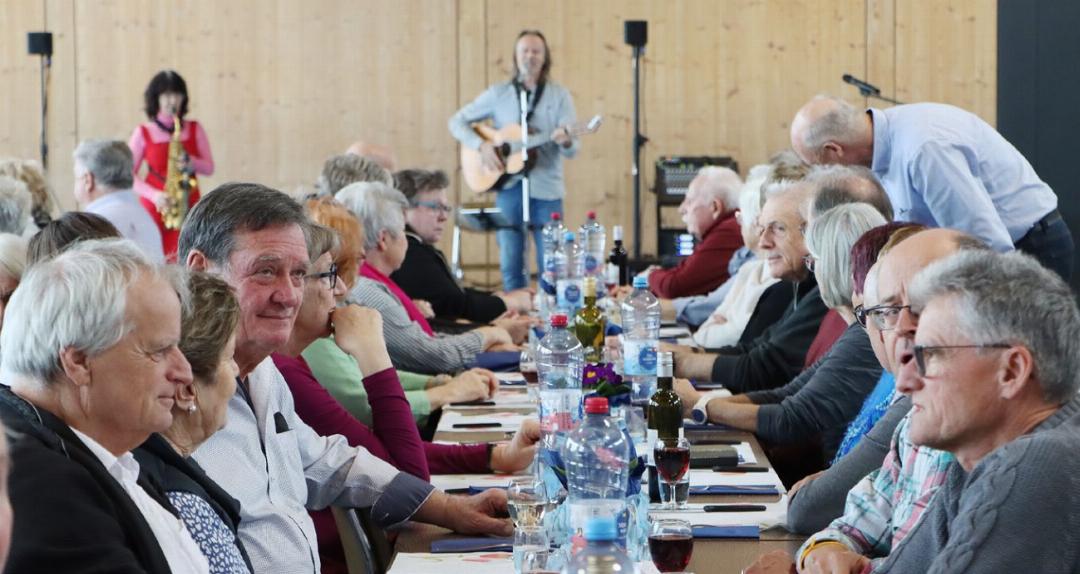 Der Anlass war wie jedes Jahr sehr gut besucht. 125 Einwohnerinnen und Einwohner nahmen am Mittwoch am Seniorennachmittag in Wohlenschwil teil. Der Landfrauenverein war für die Organisation und den Service besorgt. «Das Essen ist von Küchenchef René Hauri und seinem Team vom Alterszentrum Im Grüt in Mellingen», verriet Judith Füglistaller, Präsidentin der Landfrauen. Und der beliebte Küchenchef Hauri gab nochmals so richtig Vollgas. Er geht im März in Pension. Er liess es sich daher nicht nehmen, persönlich vor Ort zu sein und ging nach dem Essen von Tisch zu Tisch. Die Anwesenden kamen aber nicht nur kulinarisch auf ihre Kosten. Für musikalische Akzente sorgte die Mellinger Band SSASSA. Als Sahnehäubchen servierte Gemeindeammann Roger Aerne Neuigkeiten aus dem Gemeindehaus. (dg)