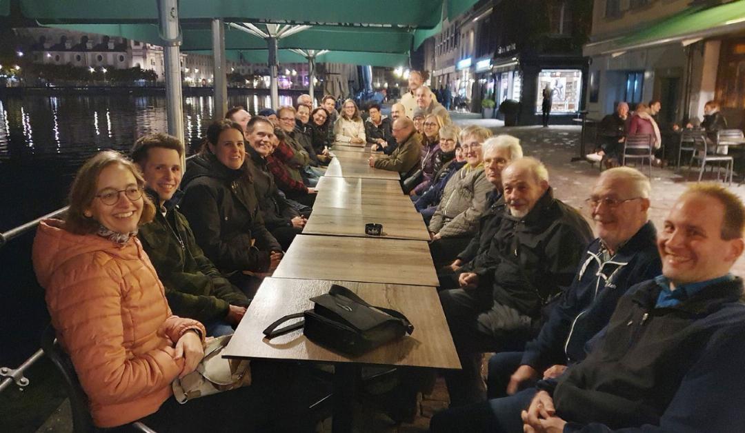 Am frühen Nachmittag trafen sich die Teilnehmenden beim Probelokal, von wo aus es in Fahrgemeinschaften Richtung Luzern ging. Ziel war das KKL – das weltbekannte Kultur- und Kongresszentrum, ein architektonisches Meisterwerk des französischen Architekten Jean Nouvel und des amerikanischen Akustikers Russell Johnson. Im Rahmen einer spannenden Führung erhielten die Musikantinnen und Musikanten exklusive Einblicke in das Gebäude: vom Luzerner Saal über den grossen Konzertsaal bis hin zur Dachterrasse mit atemberaubender Aussicht auf die Stadt, den Vierwaldstättersee und die Rigi. Die Gruppe erfuhr nicht nur architektonische und geschichtliche Details, sondern auch Kurioses – etwa, dass beim Eröffnungskonzert vor 25 Jahren eine Besucherin ins Wasser fiel und daraufhin die Wasserkanäle nachgebessert werden mussten. Auch die eindrückliche Akustik kam nicht zu kurz. Besonders spannend: die Besichtigung der sogenannten Echokammertore. Nach der rund einstündigen Führung ging es zu Fuss – vorbei an der Kapellbrücke und entlang der Reuss – zum Restaurant La Terrazza. Das Abendessen gestaltete sich etwas hektisch. Die letzten Pizzen trafen erst zehn Minuten vor dem Aufbruch ein. Der guten Stimmung tat das jedoch keinen Abbruch.