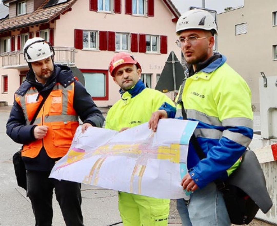 Die Schirme waren bereitgestellt. Doch Petrus hatte ein Einsehen und schloss just für die Baustellenbesichtigung der Bauphase 1 die Schleusen. Genau 20 Interessierte, Stadtpräsidentin Györgyi Schaeffer, Stadtrat und Ressortvorsteher Martin Huber, Bauleiter Thomas Hunn, Bauführer Mateus Tanushaj und Polier Nikolla Krist waren vor Ort. Bauleiter Hunn zeigte am Montag kurz vor dem Mittag direkt bei der Baugrube, was seit dem Baustart im Januar in der ersten Bauetappe über die Bühne ging.