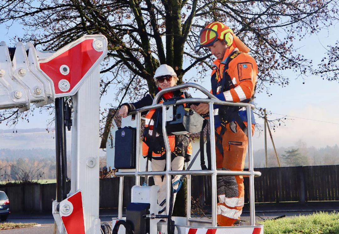 Es herrschte bestes Wetter, als die Werkhofmitarbeiter des Kantons am Donnerstagmorgen eintrafen. Ihre Mission beim Gnadenthaler Kreisel: den Storchenhorst zu verkleinern. Noch ahnte das Storchenpaar, das seit 2020 auf dem Kandelaber nistet, nichts. Es liess sich bis zehn Uhr nicht blicken. Doch kaum hob der Korb des mobilen Hebekrans mit Margrith Enggist, von Storch Schweiz und Urs Gehrig, Teamleiter Werkhof Wohlen, ab, flog das Storchenpaar auf ihren imposanten Horst. Sie wichen erst, als der Korb wenige Meter entfernt war. Von einer nahe gelegenen Wiese sahen sie zu, wie ihrem kunstvoll errichteten Nest mit einer Mistgabel zu Leibe gerückt wurde. «Wegen der Verkehrssicherheit muss zuweilen der Horst etwas verkleinert werden», sagt Ivan Burkart, Strassenmeister beim Departement Bau, Verkehr und Umwelt. «Am Ende des Tages geht es aber immer auch um das Tierwohl.» Deshalb war bei der Aktion Margrith Enggist von «Storch Schweiz» mit von der Partie.