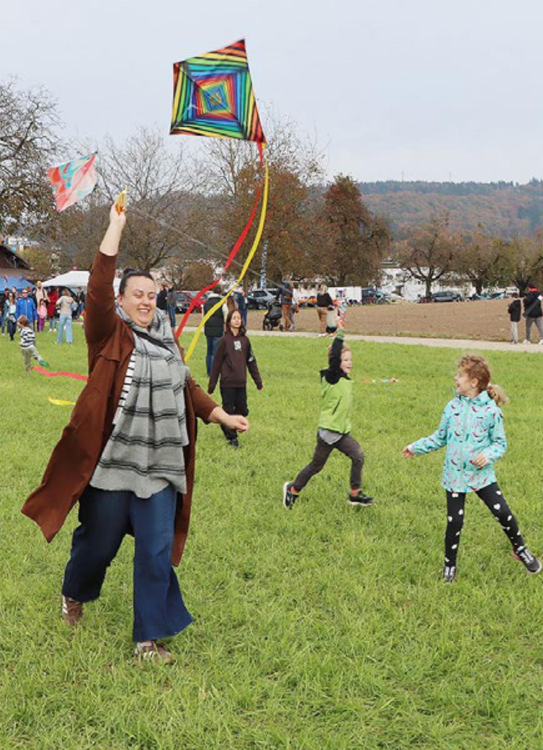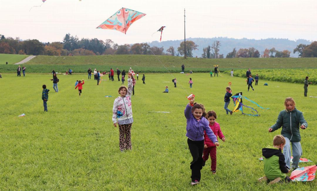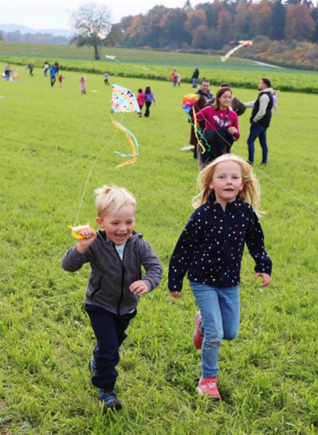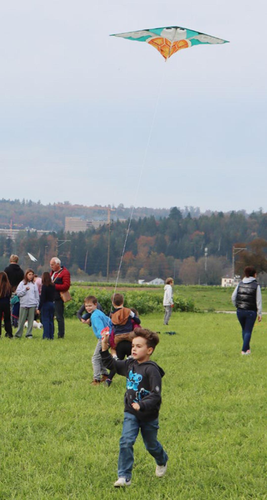 Auf der Drachenflugwiese hinter dem Mattenhof ging es am Sonntag von 11 bis 17 Uhr fröhlich zu. Drachen in allen Grössen und Farben wurden von kleinen und grossen Besitzerinnen und Besitzern steigen gelassen. Das bei bestem Herbstwetter. Der einzige Spielverderber war der Wind – eine regelrechte Flaute herrschte. Davon liess sich aber niemand entmutigen. Rennen war angesagt, um die Drachen in der Luft zu halten. Und das bereitete sichtlich Spass. Gelächter hallte über die Wiese.
