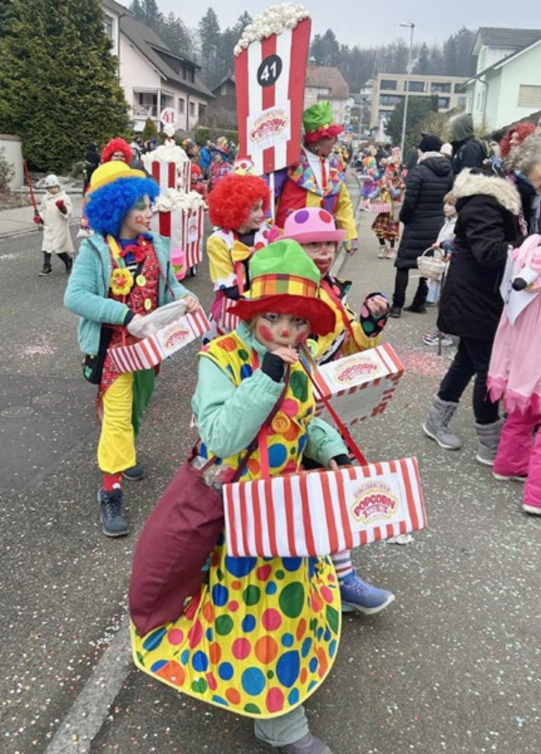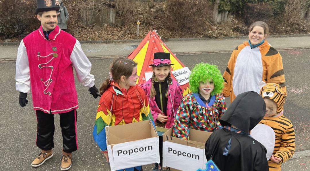 Clowns, Tiger und Pop-Corn-Verkäuferinnen und -Verkäufer feiern das Jubiläum «Fünf Jahre Kinderfasnacht»