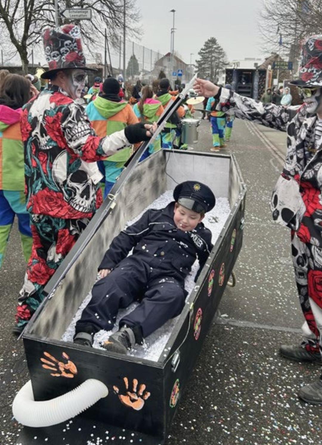 Als sich nach 13 Uhr am Samstagnachmittag die Trottoirs entlang der Umzugsroute in Fislisbach füllten – sie führte über die Birmenstorfer-, Bernarda- und die Jurastrasse, waren unter den Zaungästen aber auch Zirkustiere zu entdecken: Löwen und Tiger, als besondere Attraktionen auch ein Dinosaurier oder ein Hai in luftiger Hülle. Über die Quartierstrassen zogen dann der «kleinste Zirkus der Welt», die «Pop-Clowns» mit Pop-Corn oder der Spielgruppenverein Eichblatt mit «Kunterbunt» – die übrigens in exakt dieser Reihenfolge in der Kategorie Gruppe dann auch die Preise holten bei der Maskenprämierung. Begleitet wurden sie von Guggenmusigen und Fasnachtswagen aus der näheren Umgebung. So sorgten unter anderem die Badener Jugendgugge «Notenklecksler» oder auch die Rohrdorfer «Bänkli-Clique» und die «Sumpfberghüüler» für Stimmung. Genauso wie die Fasnachtswagen, darunter die heimischen «Chlini Feiglinge», die Stetter Fasnachtsnarren, die Mellinger «Andalusier» oder auch die Polterzunft aus Staretschwil – insgesamt zählte das OK über 350 aktive Teilnehmende. Viel Konfetti flog durch die Luft. Es wurde von den Mädchen und Buben eifrig eingesammelt, wiederverwertet und brachte Farbe auf den grauen Asphalt.